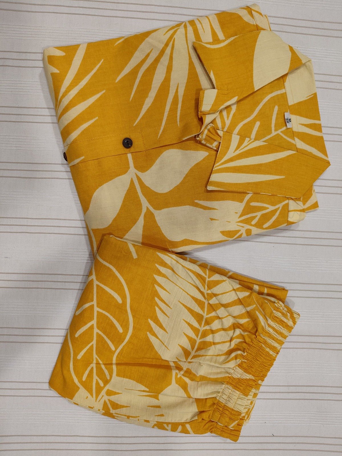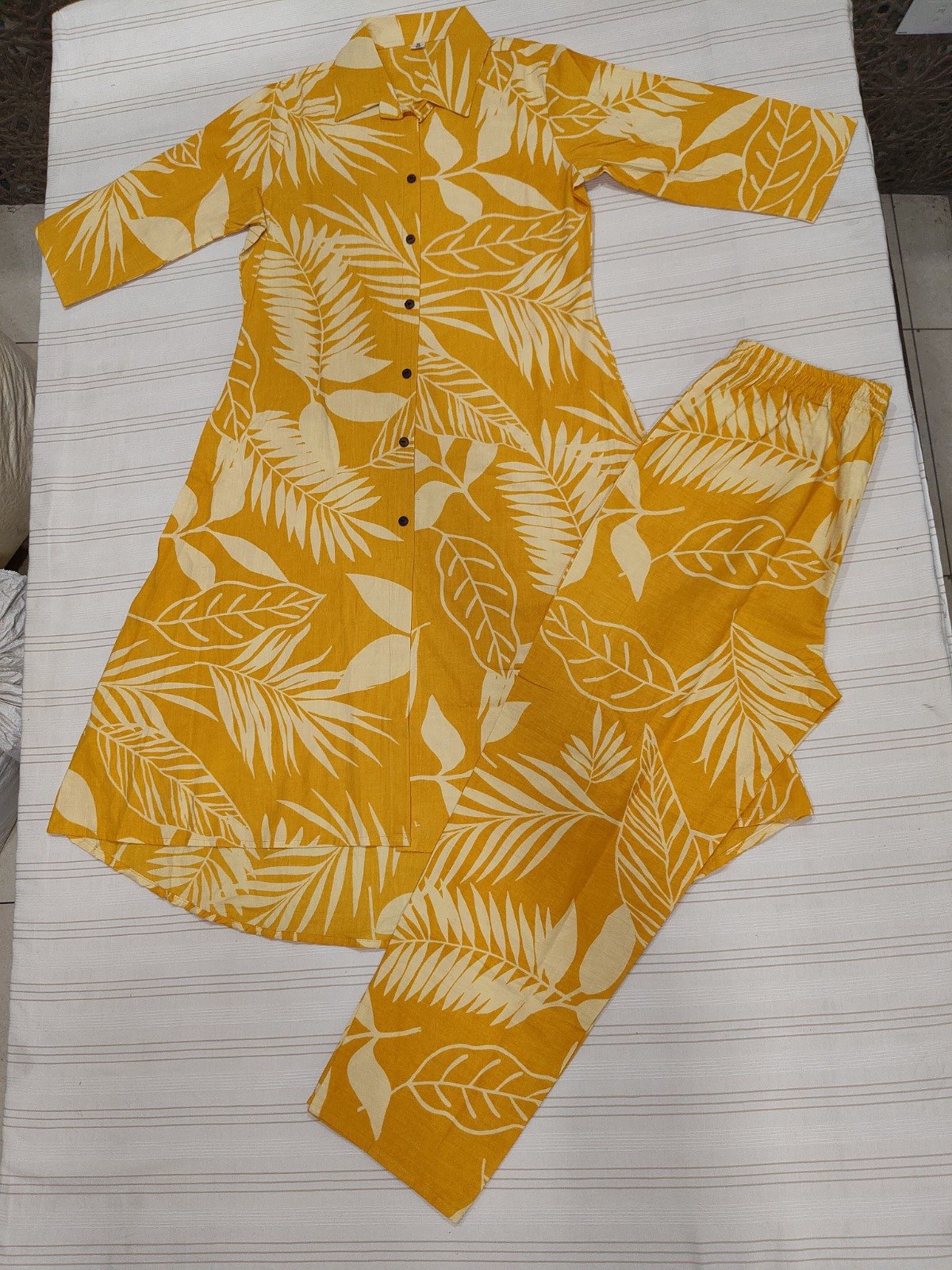 Yellow Cotton Kurti Pant Set with Leaf Print
