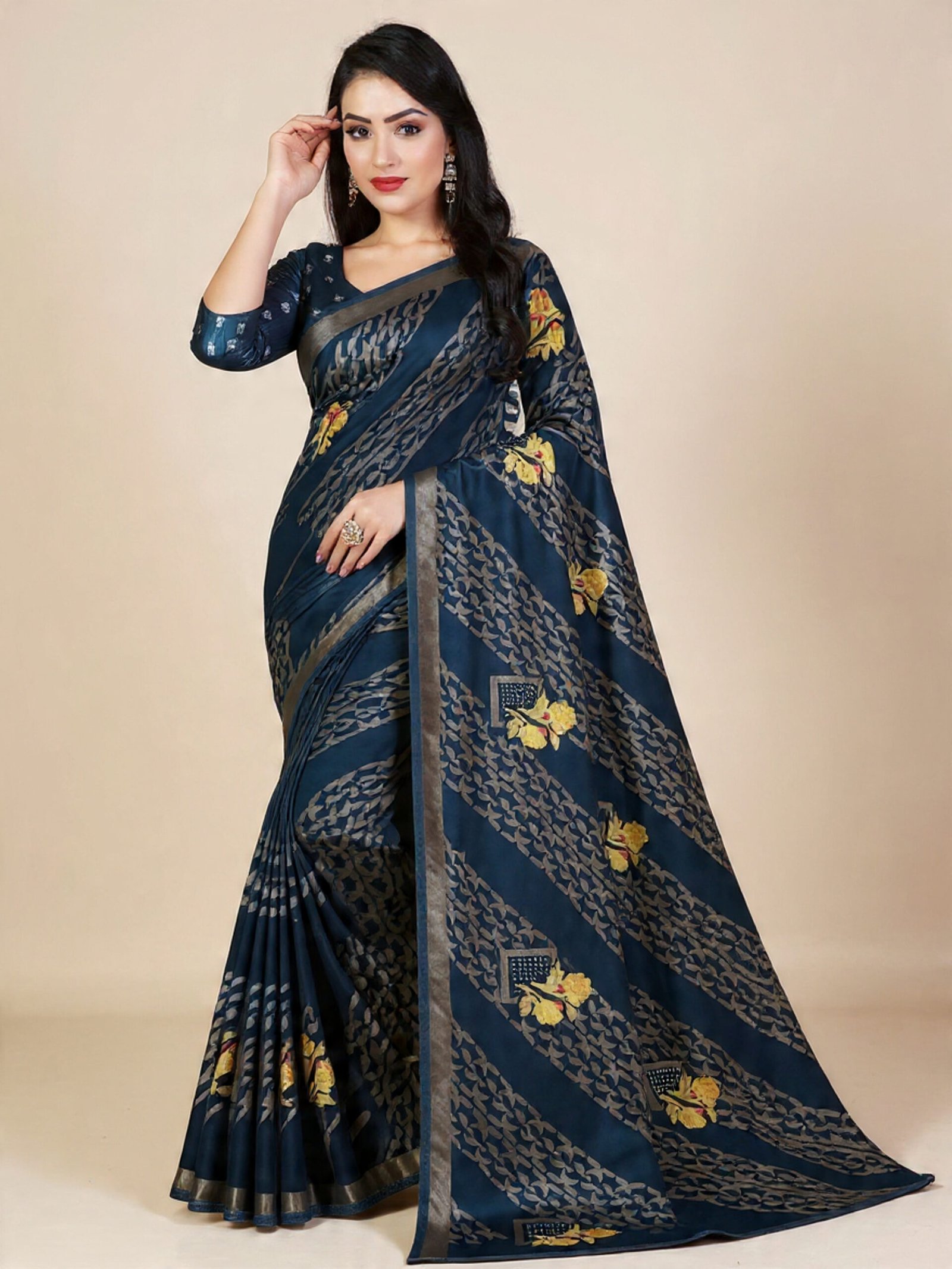 This stunning dark blue saree features a gold border and a unique pattern of diagonal stripes and yellow flowers. The saree is made from high-quality fabric, draping elegantly and showcasing intricate details. Paired with a matching blouse, this outfit is perfect for formal occasions or cultural events.