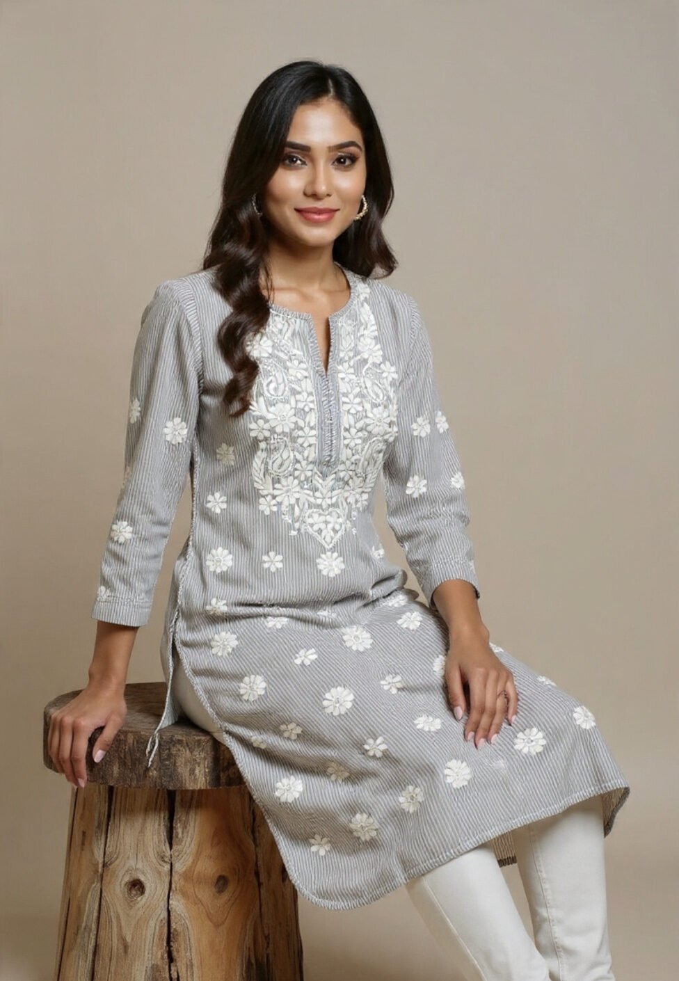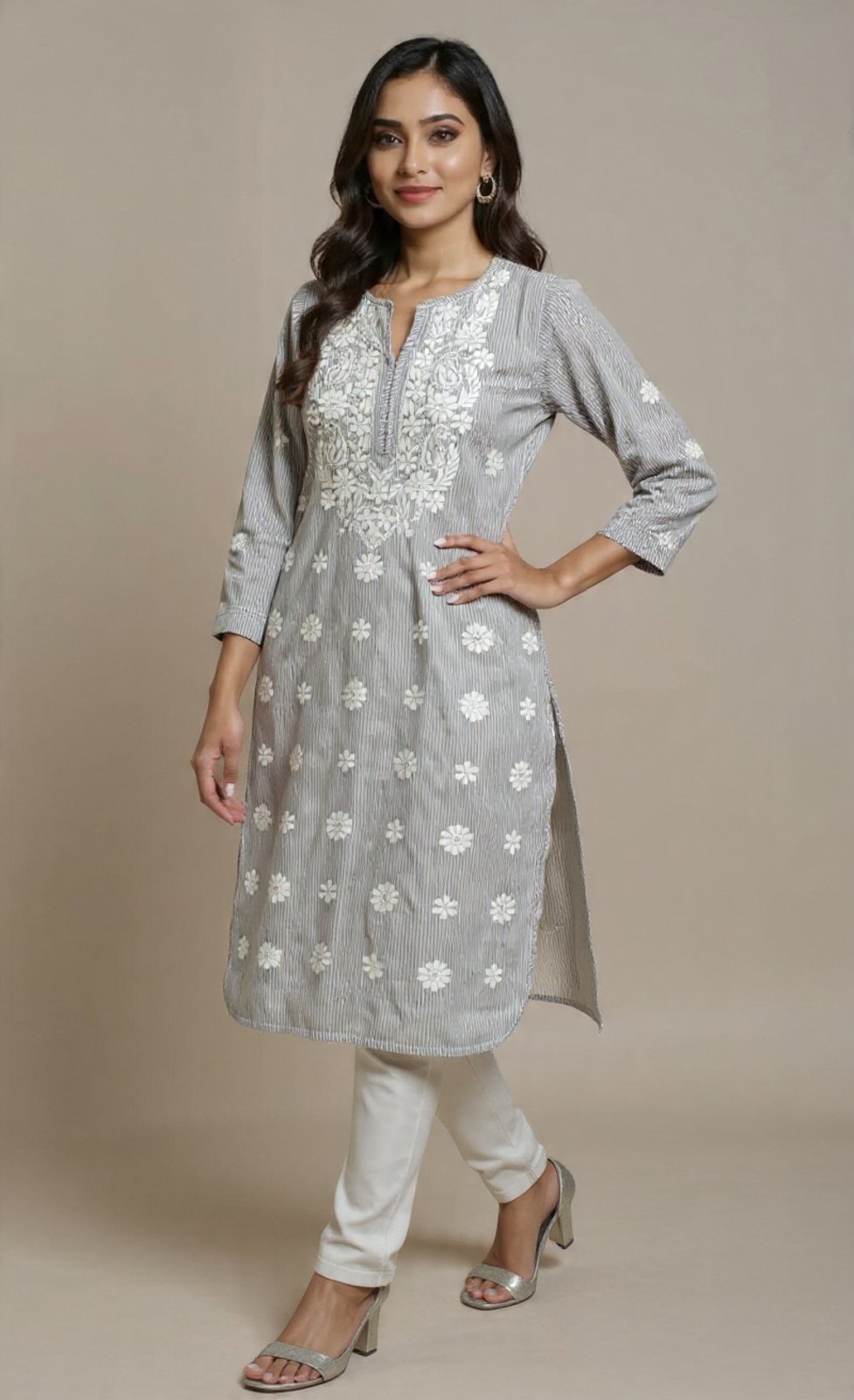 This stunning grey cotton kurti features intricate white Chikankari embroidery with floral patterns across the body and a beautifully detailed yoke. It can be paired with crisp white pants, and is perfect for casual yet elegant occasions. The kurti has three-quarter sleeves and a comfortable fit, making it ideal for everyday wear or special gatherings.