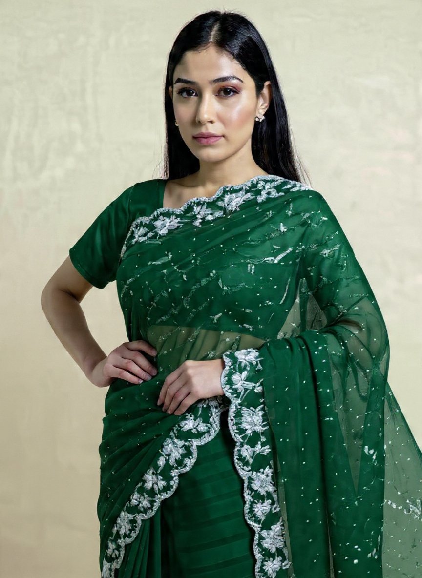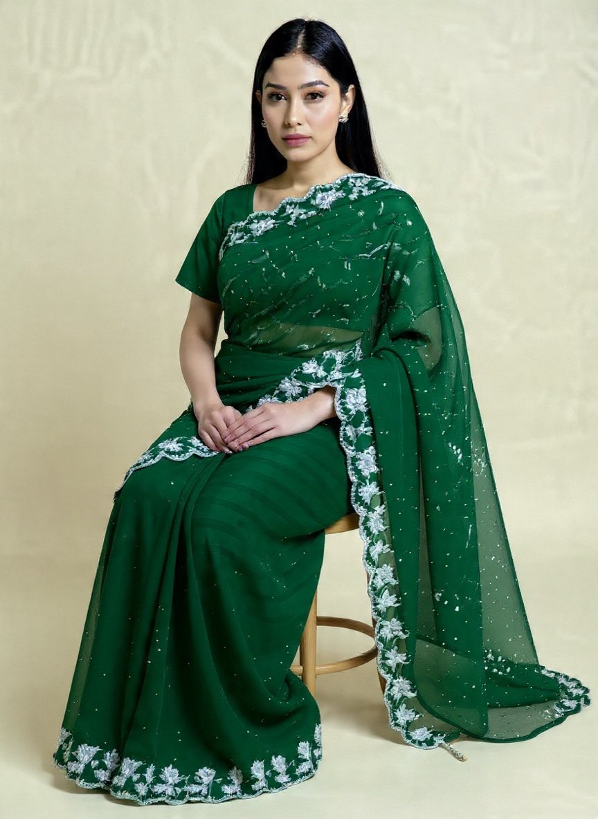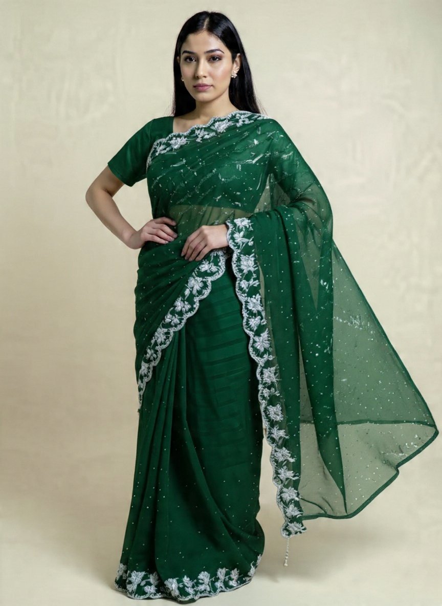 This stunning emerald green saree is crafted with intricate silver embroidery detailing on the borders and pallu. Made from a comfortable and flowing fabric, the saree features a subtle sparkle with tiny dots across the material. The saree is paired with a matching blouse that complements the overall look. Perfect for festive occasions or special events, this saree adds a touch of elegance and sophistication to any outfit.