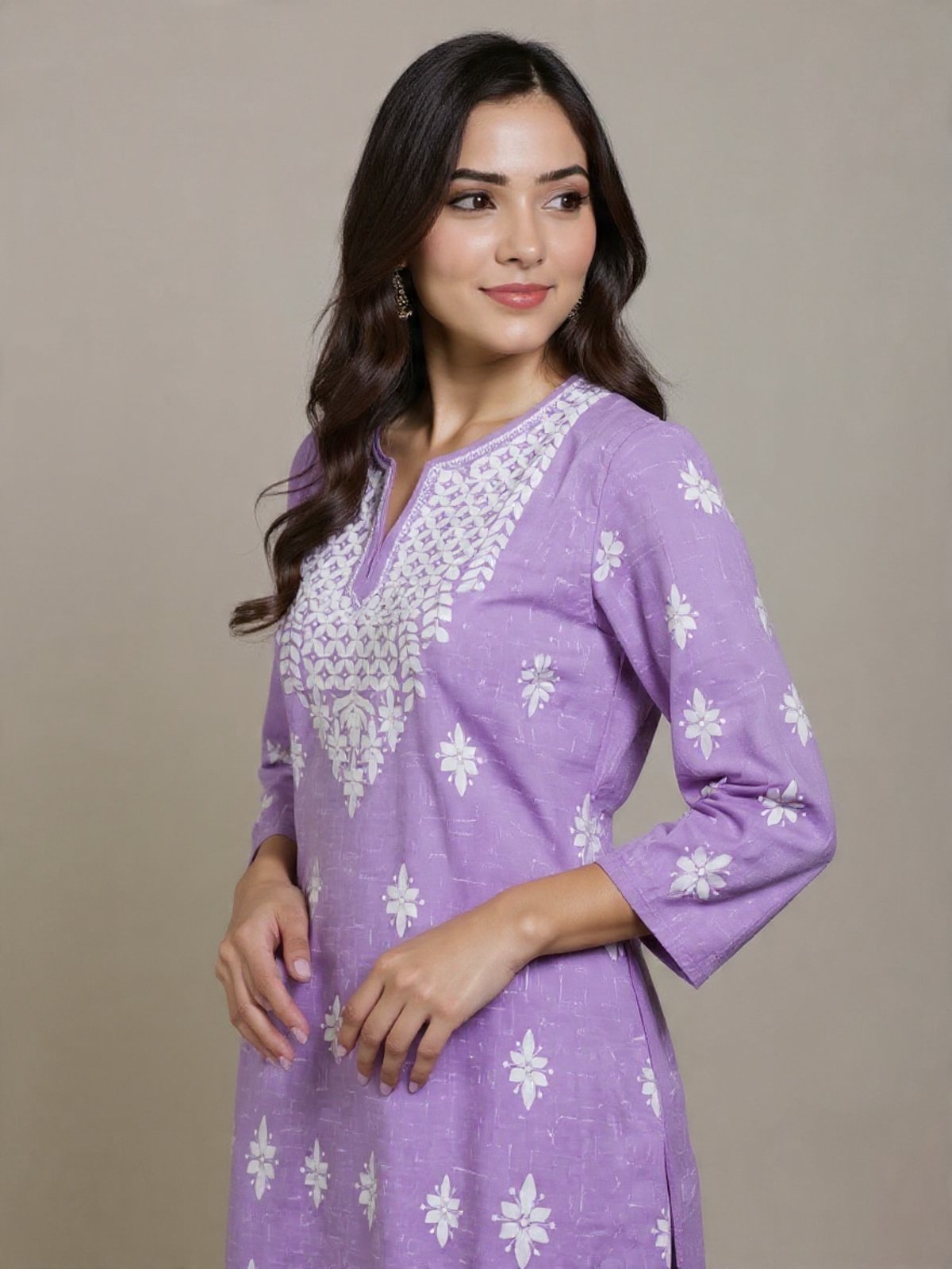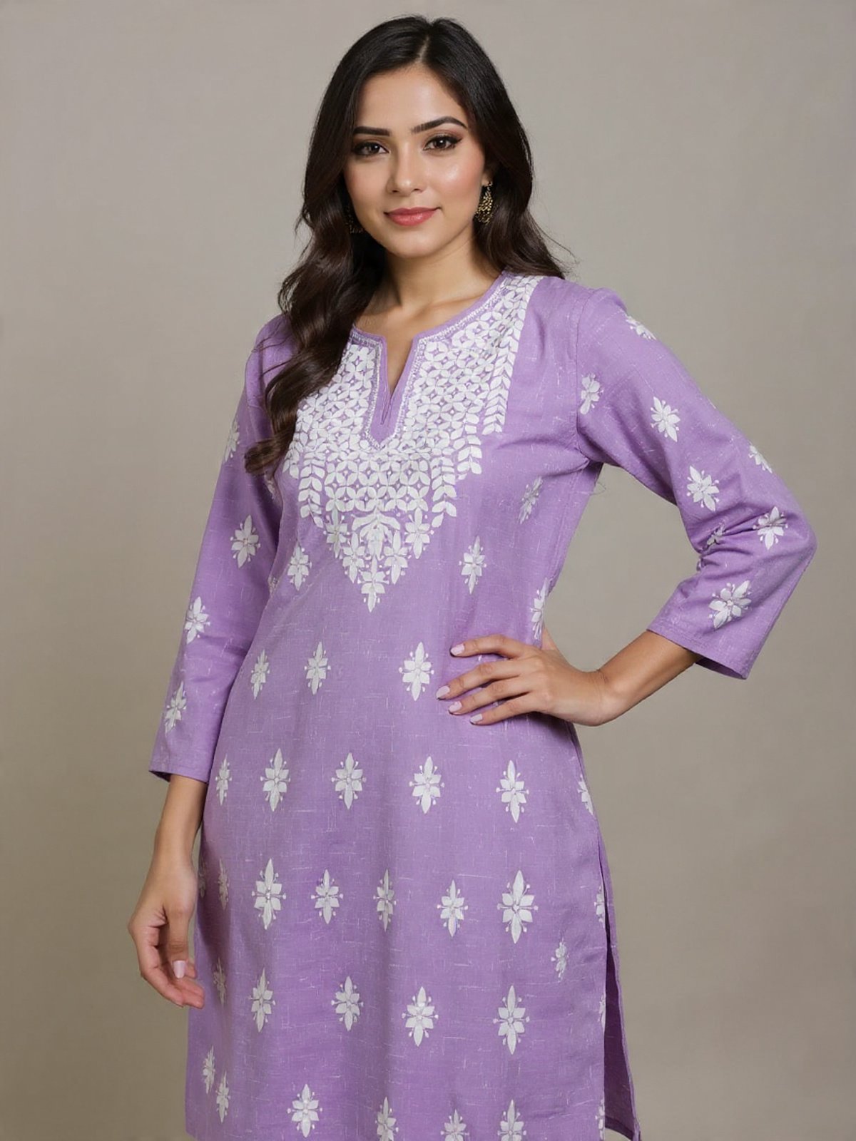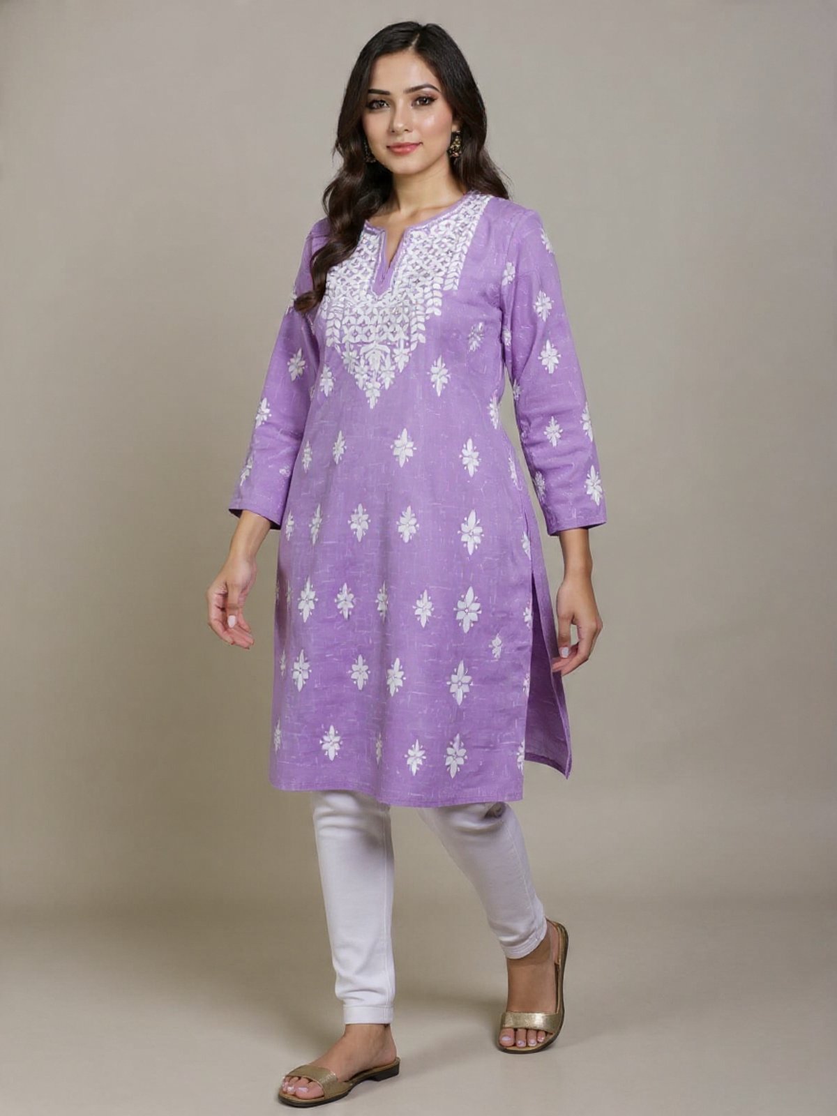 This stunning lavender cotton kurti is adorned with intricate white Chikankari embroidery on the neckline and scattered floral motifs across the dress. Perfect for a casual yet elegant look, this kurti is made from comfortable cotton fabric, ideal for India’s warm climate. The three-quarter sleeves add a touch of sophistication, making it suitable for various occasions.