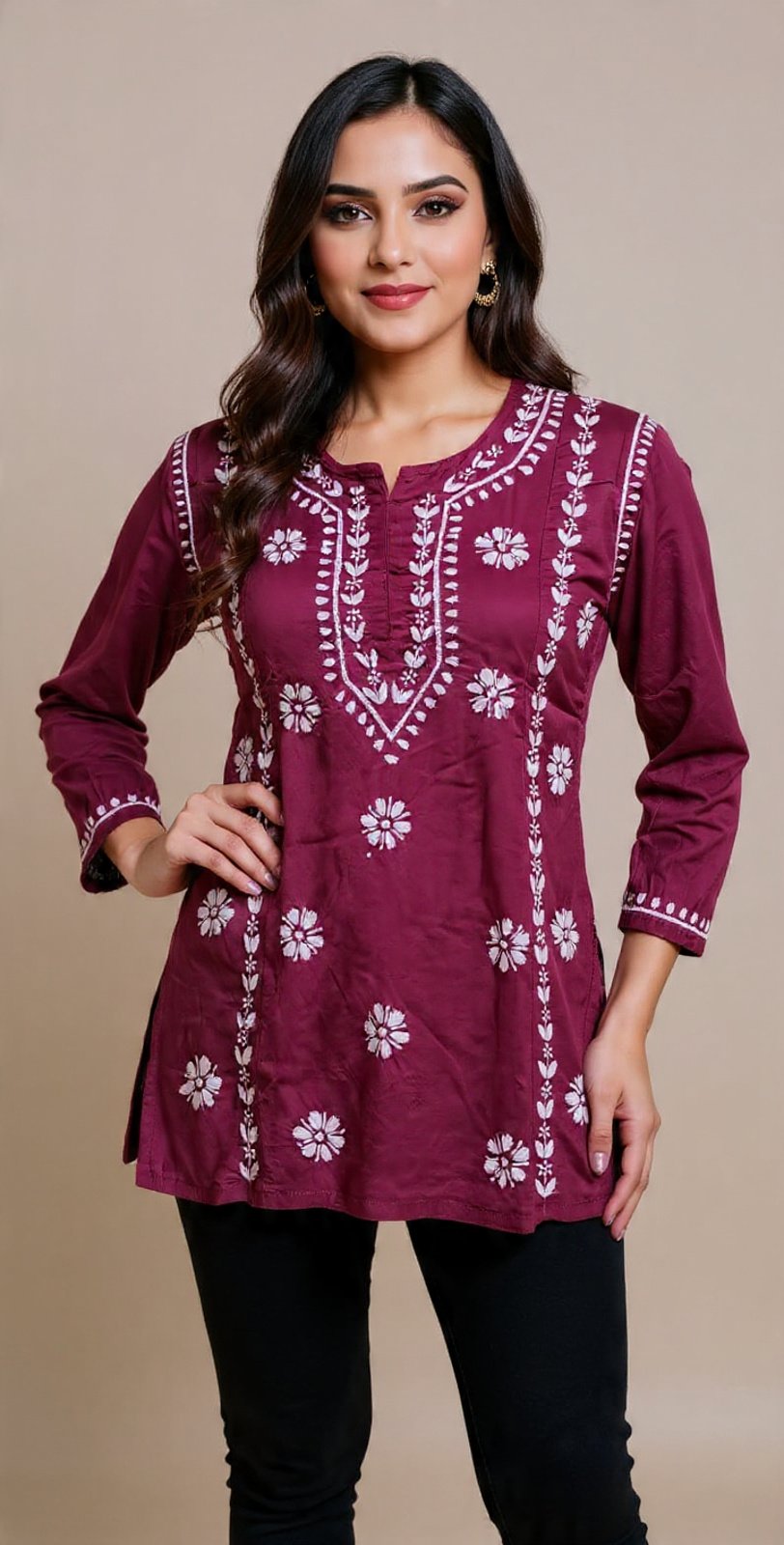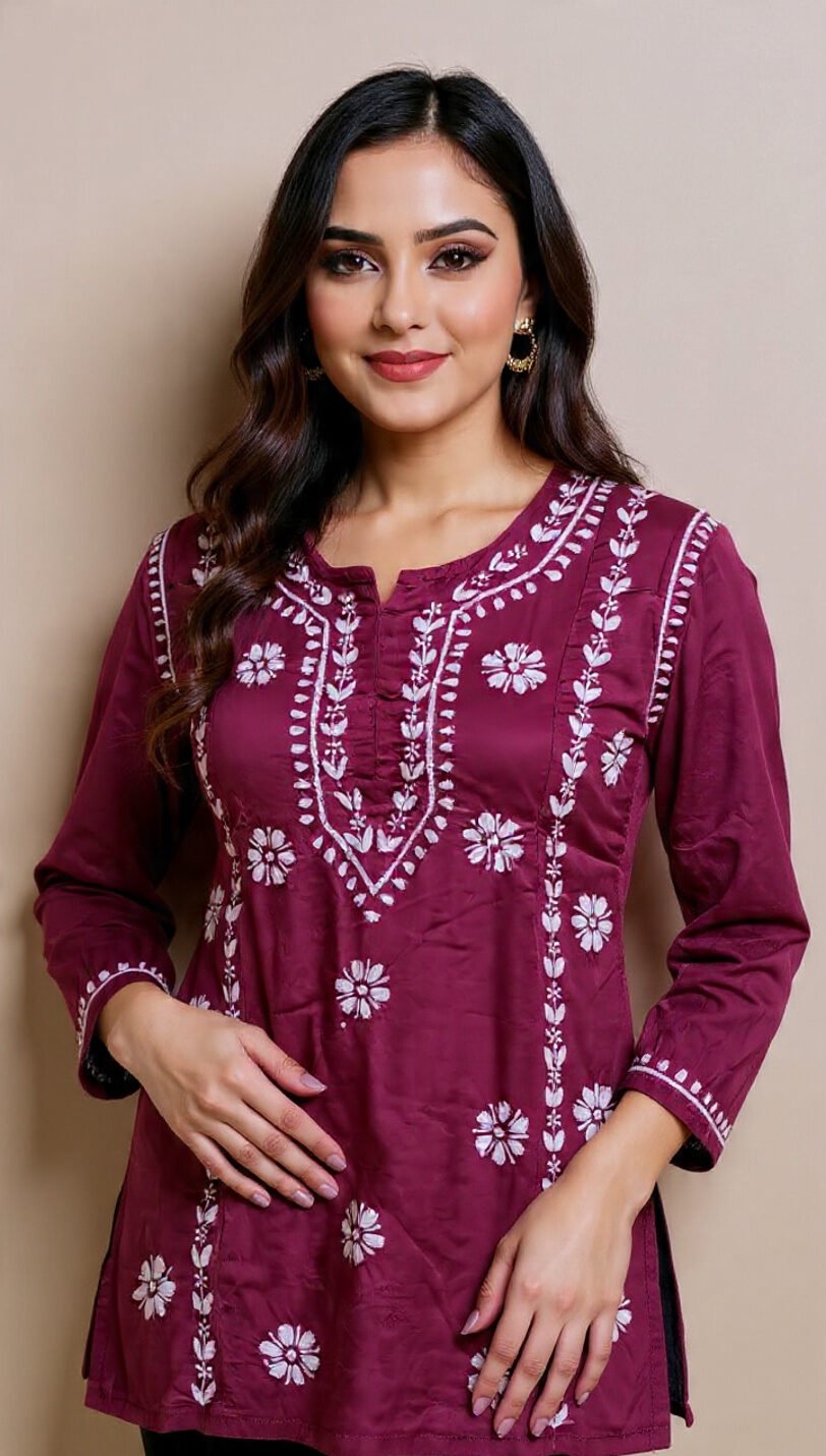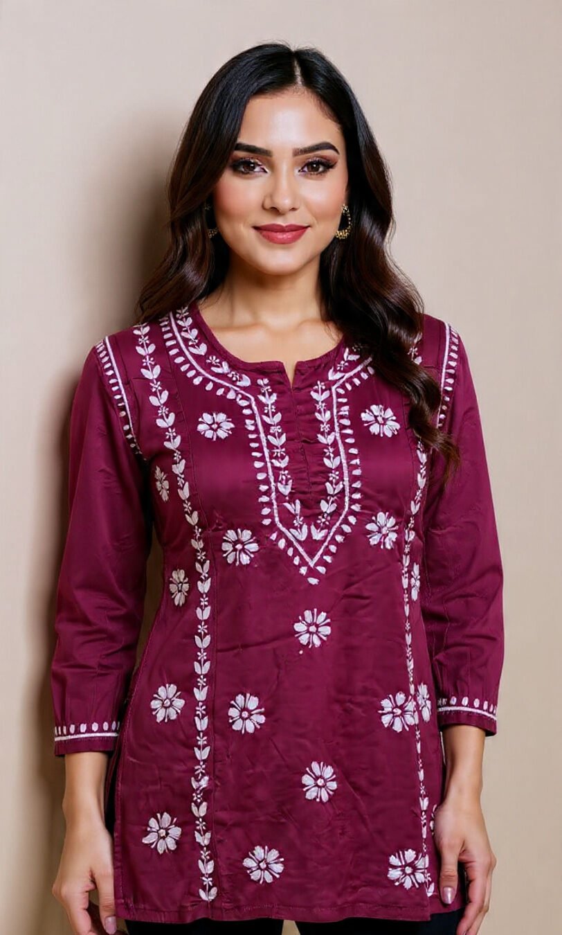 This stunning maroon rayon kurti is adorned with intricate white floral embroidery, perfect for adding a touch of elegance to your everyday look. Crafted with comfort and style in mind, it pairs beautifully with black leggings or pants for a chic outfit.