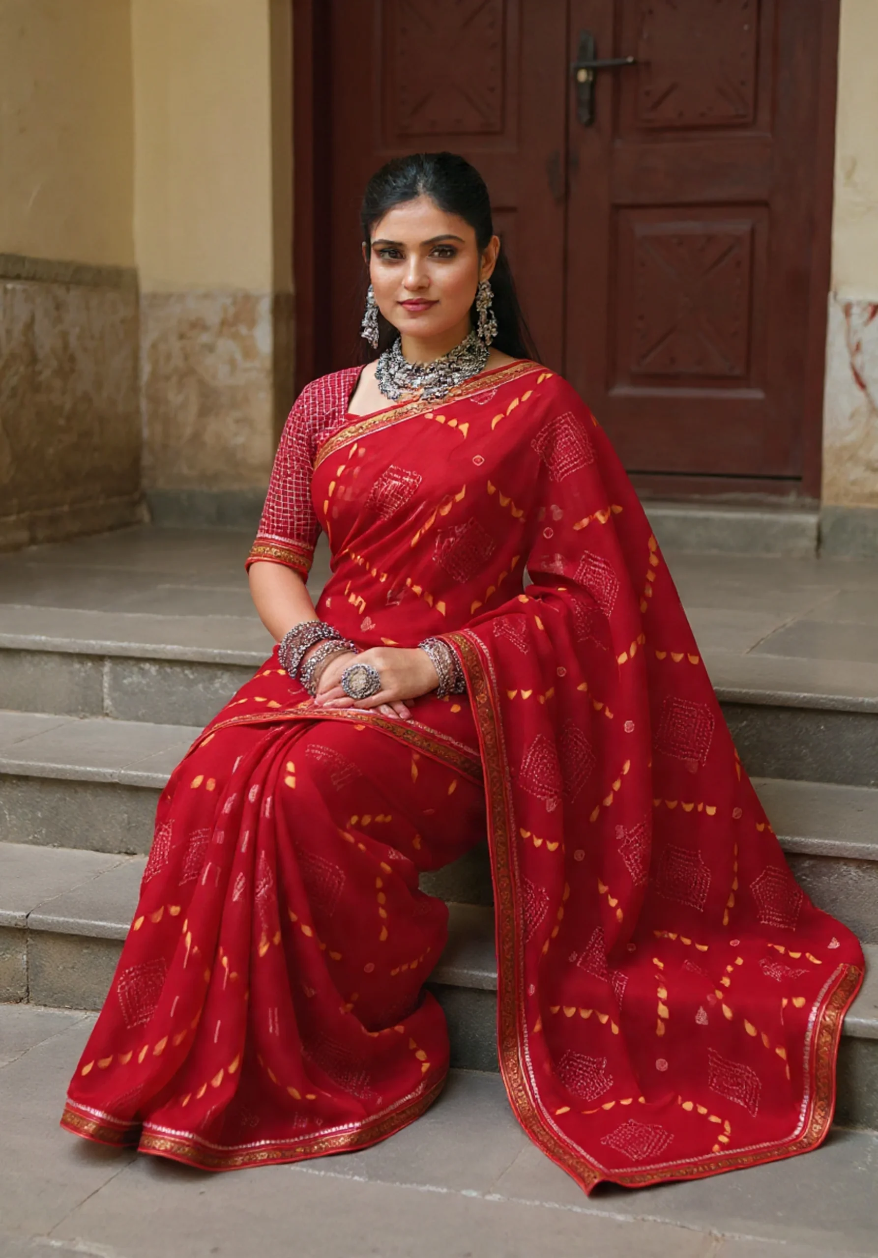 A stunning orange saree featuring traditional Bandhani patterns with gold accents. Perfect for cultural events, weddings, or festive occasions. Paired beautifully with silver jewelry for an elegant look.