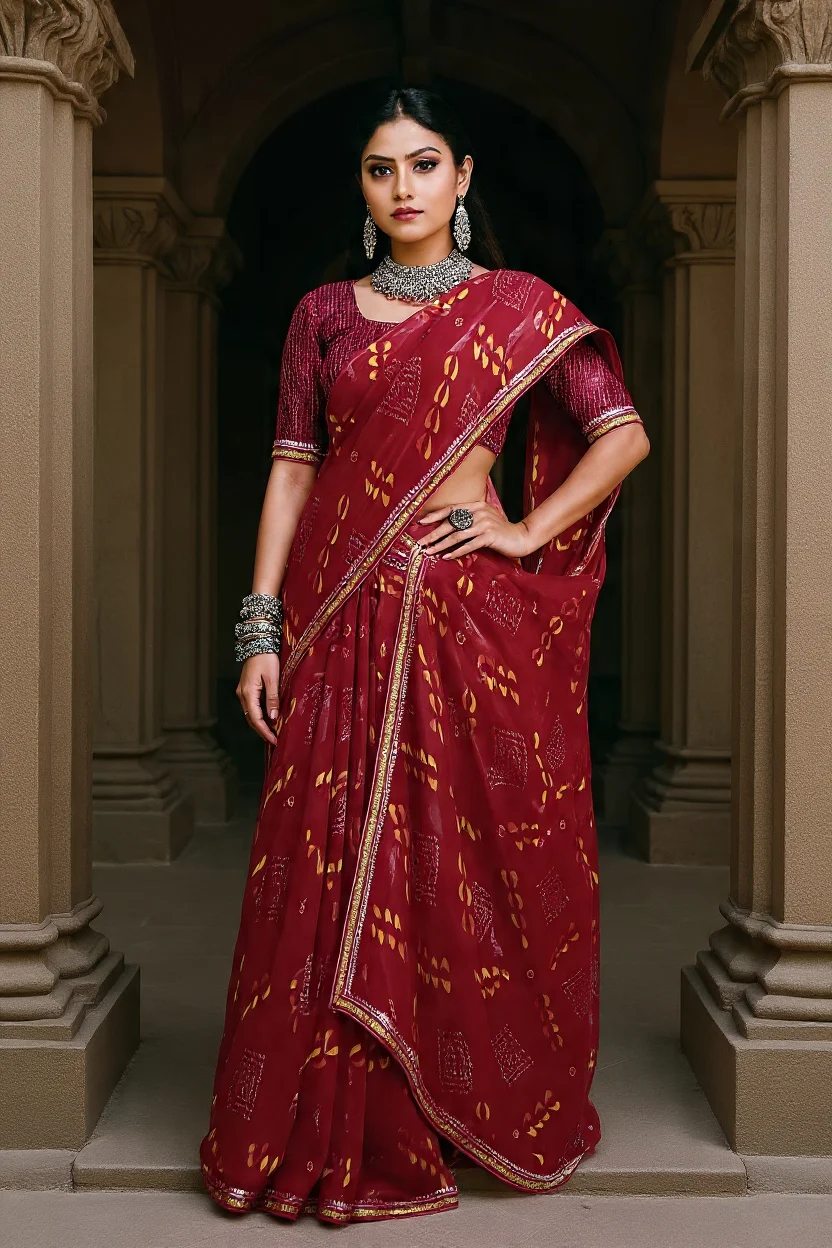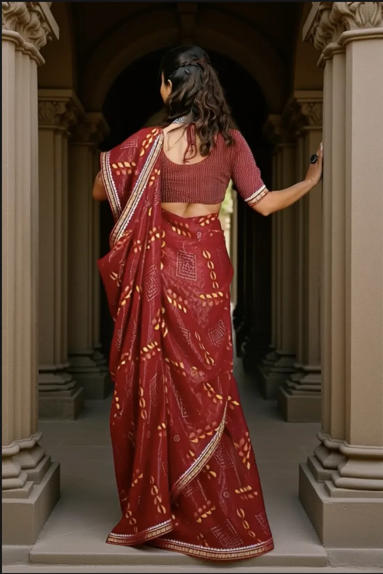 This stunning red saree features intricate bandhani patterns with gold accents, paired with a matching red blouse. The saree is adorned with a gold and white border, adding a touch of elegance. Perfect for traditional occasions like weddings, festivals, or cultural events. The model is accessorized with silver jewelry, complementing the saree’s rich look.