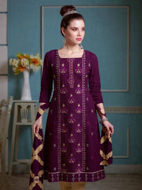 Elevate your ethnic wardrobe with our Royal Plum Embroidered Unstitched Suit. This stunning plum-colored suit features intricate gold embroidery and is crafted from high-quality cotton. The matching dupatta with embroidered border adds a touch of elegance, making it perfect for festive and wedding occasions. Get this unstitched suit tailored to fit your style and pair it with some statement jewelry to shine.