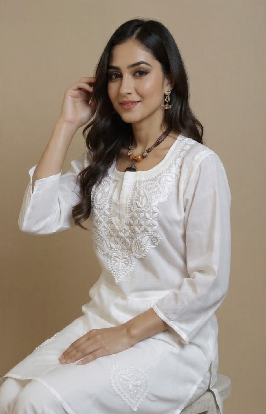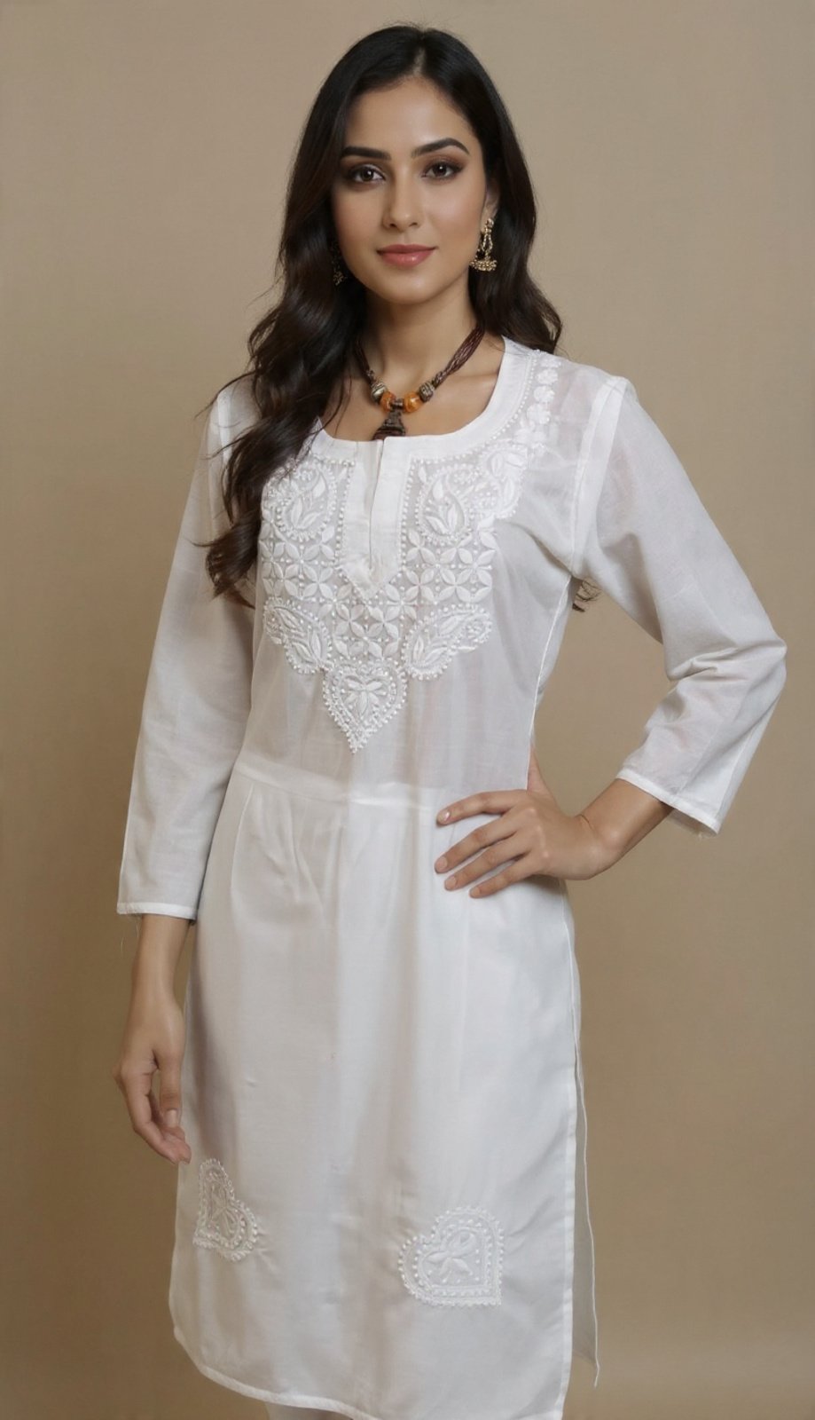 This stunning white cotton kurti features intricate Chikankari embroidery on the chest and lower part of the dress. The kurti has a round neck, three-quarter sleeves, and is adorned with delicate floral patterns. It can be Paired with traditional accessories like the brown and orange necklace and gold earrings in the image, this kurti is perfect for casual outings or festive occasions.